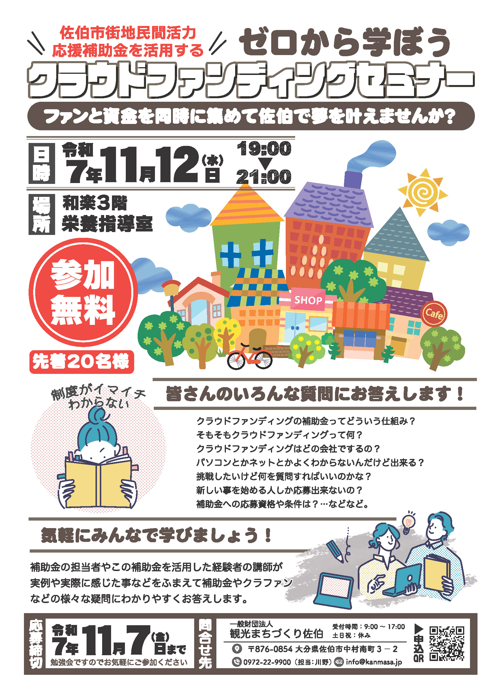 令和7年11月12日(水)19:00~21:00に和楽3階にある栄養指導室において「佐伯市街地民間活力応援補助金(クラファン補助金)」のセミナーを開催いたします。