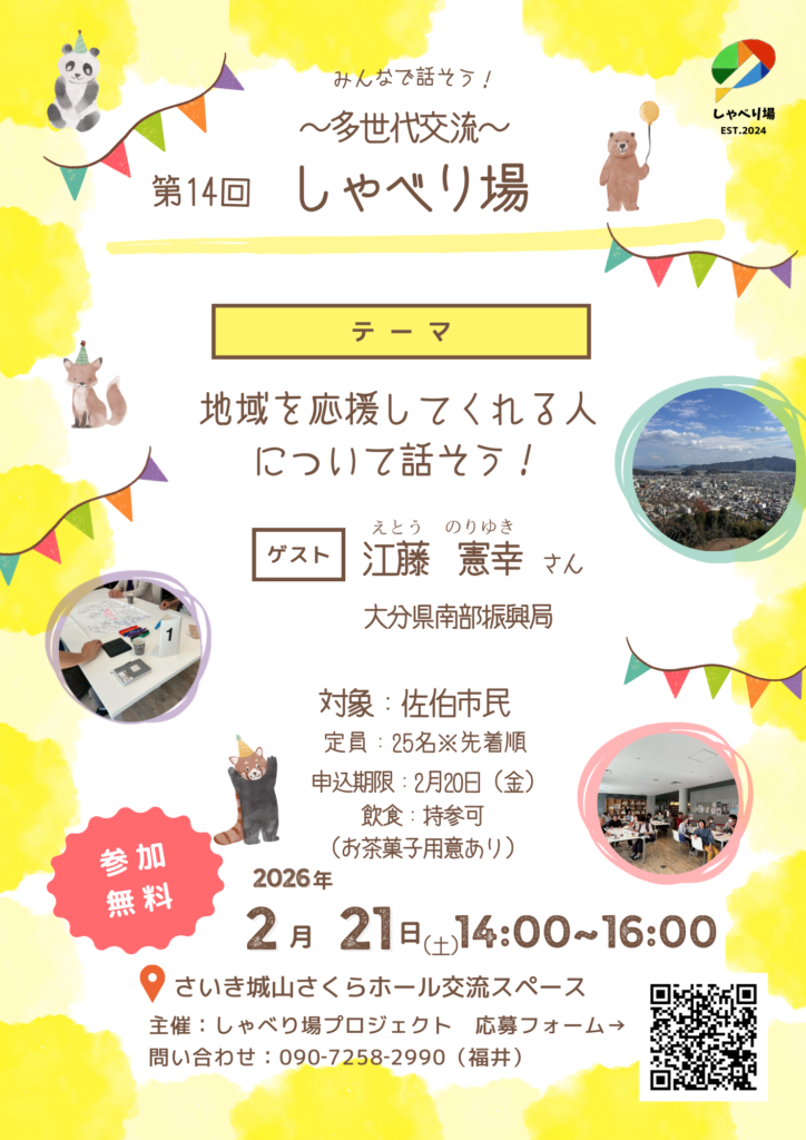 令和8年2月21日(土)14:00~16:00よりさいき城山桜ホールの交流スペースにて「第14回 しゃべり場」を開催します。