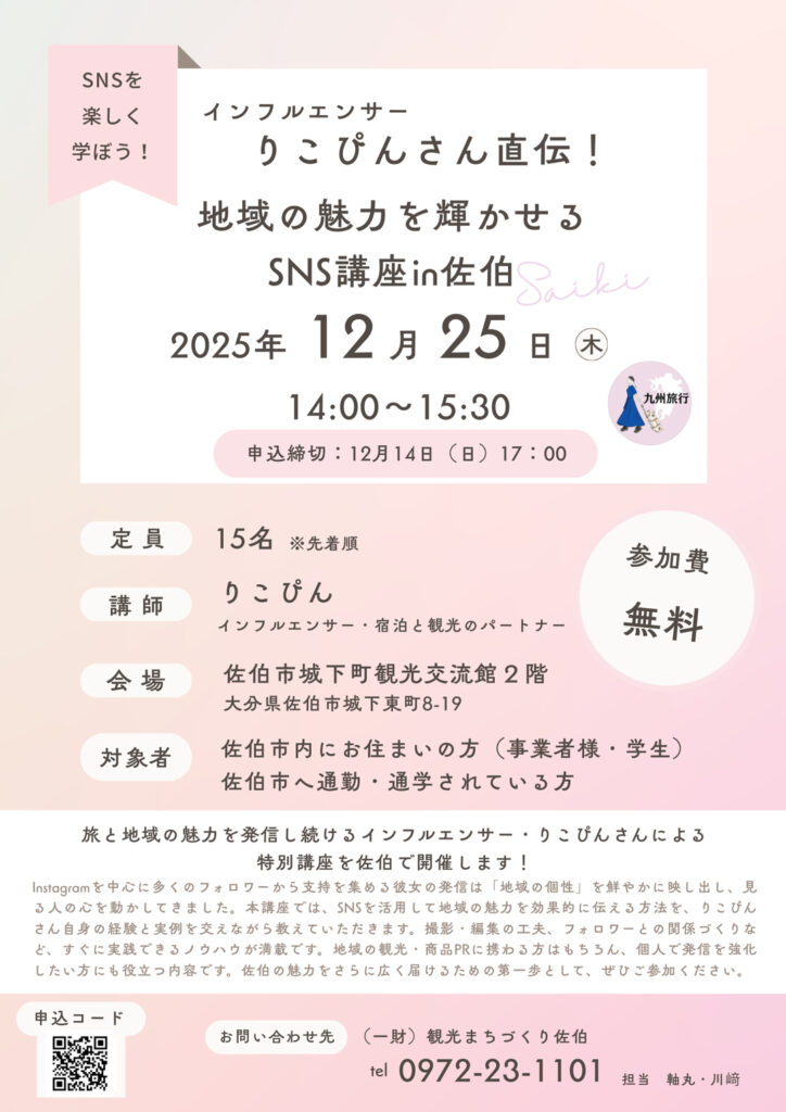 旅と地域の魅力を発信し続けるインフルエンサー・りこぴんさんによる特別講座を佐伯で開催します!